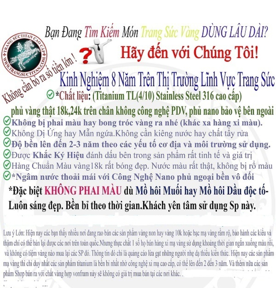 - **Hàng này không rỉ và đen đâu nhé.Các sản phẩm bên Shop đa phần hàng quốc tế.Phủ Nano chống trầy xước và bền bỉ hơn nhé Cứ mang tắm rửa thoải mái dùng cả năm. Sử dụng thoải mái tắm gội xà phòng nó chỉ cũ màu đi xíu chứ không bong tróc vàng như các loại hợp kim nhé.